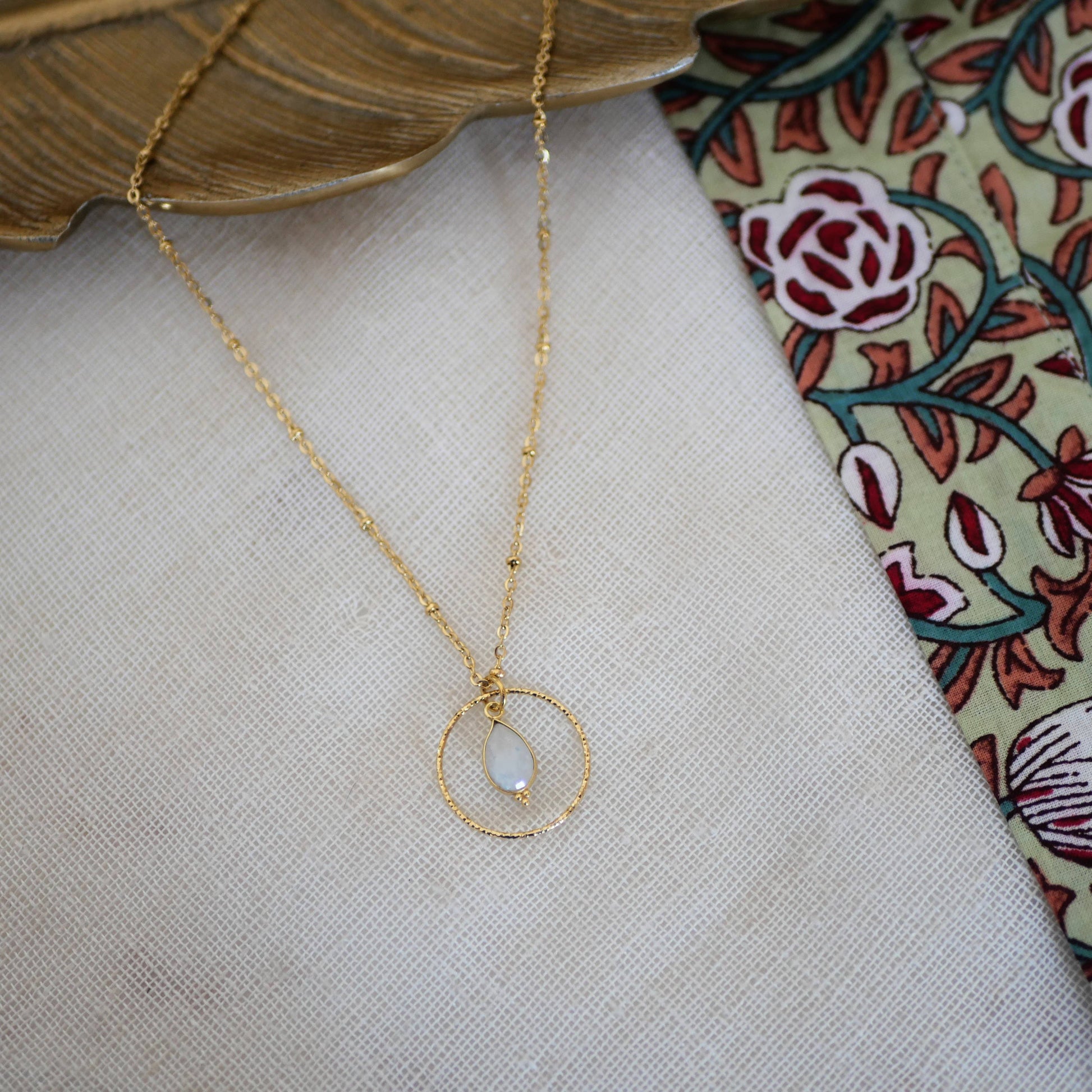 halsketting in roestvrij staal, versierd met: labradoriet, tijgeroog, rozenkwarts, amethist, maansteenregenboog (ook wel witte labradoriet of peristerite genoemd) of Amazoniet. Meet ongeveer 42 cm. Wordt geleverd met etui.