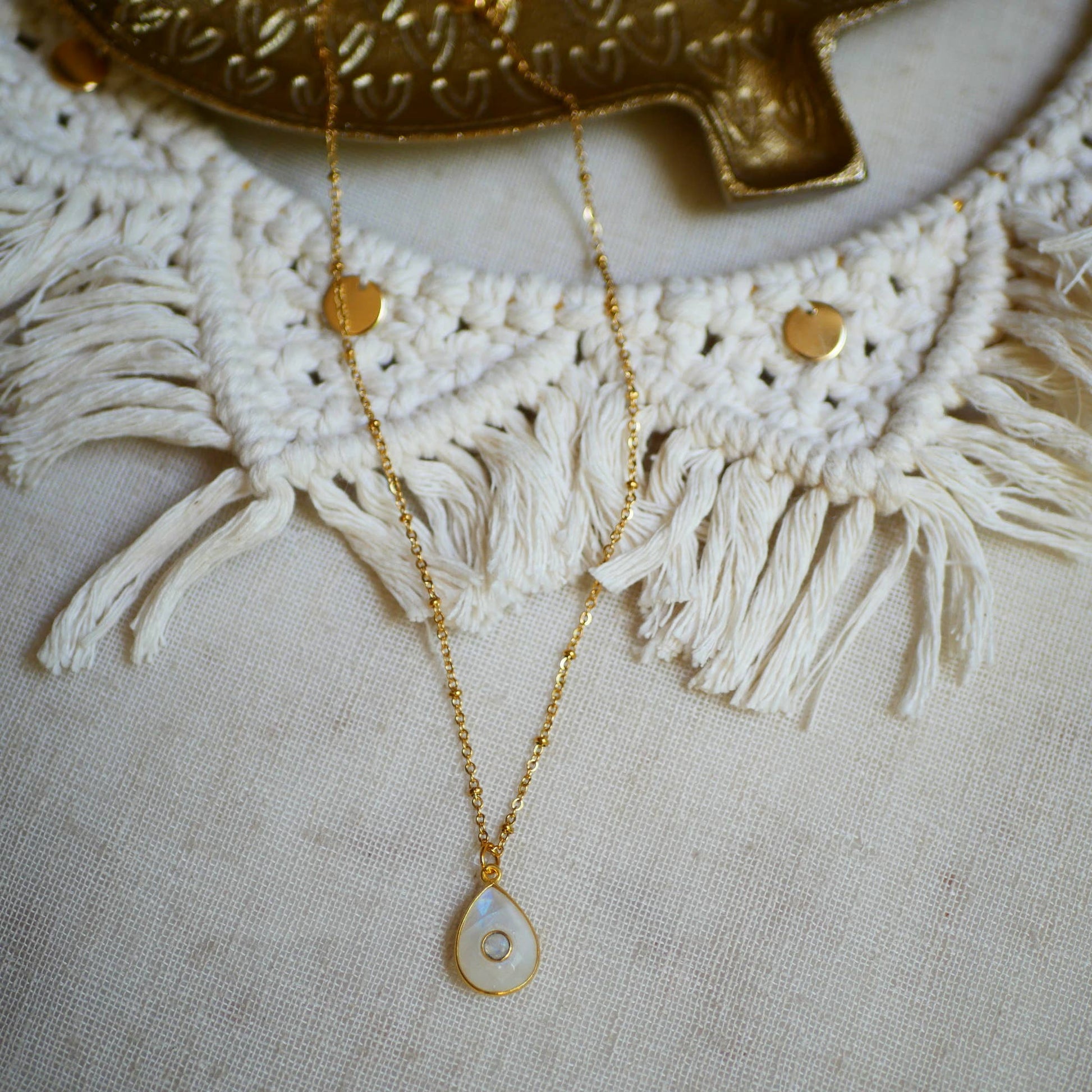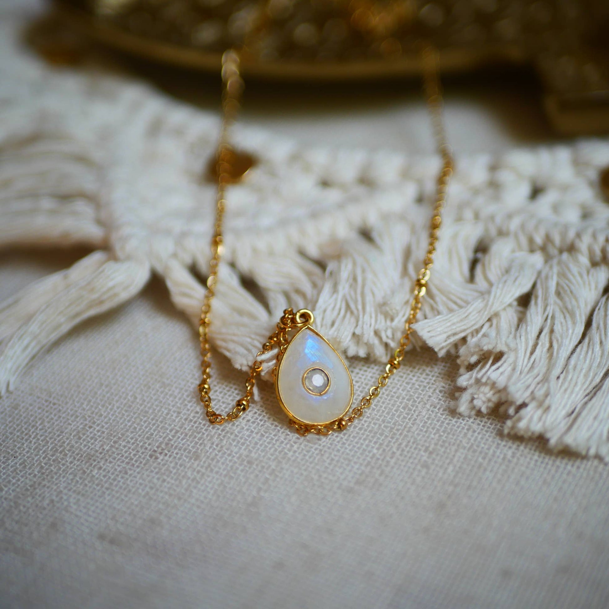 Halsketting van roestvrij staal met een druppelvormige regenboogmaansteen met een kleine regenboogmaansteen in het midden.