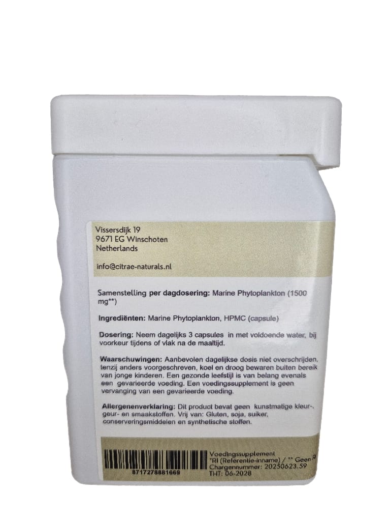 Marien Phytoplankton: Dit mariene phytoplankton is een combinatie van drie soorten algen: Fucus vesiculosus, Blauwe Spirulina en Chlorella. Deze unieke samenstelling zorgt voor een krachtige bron van voedingsstoffen die snel door het lichaam kunnen worden opgenomen.