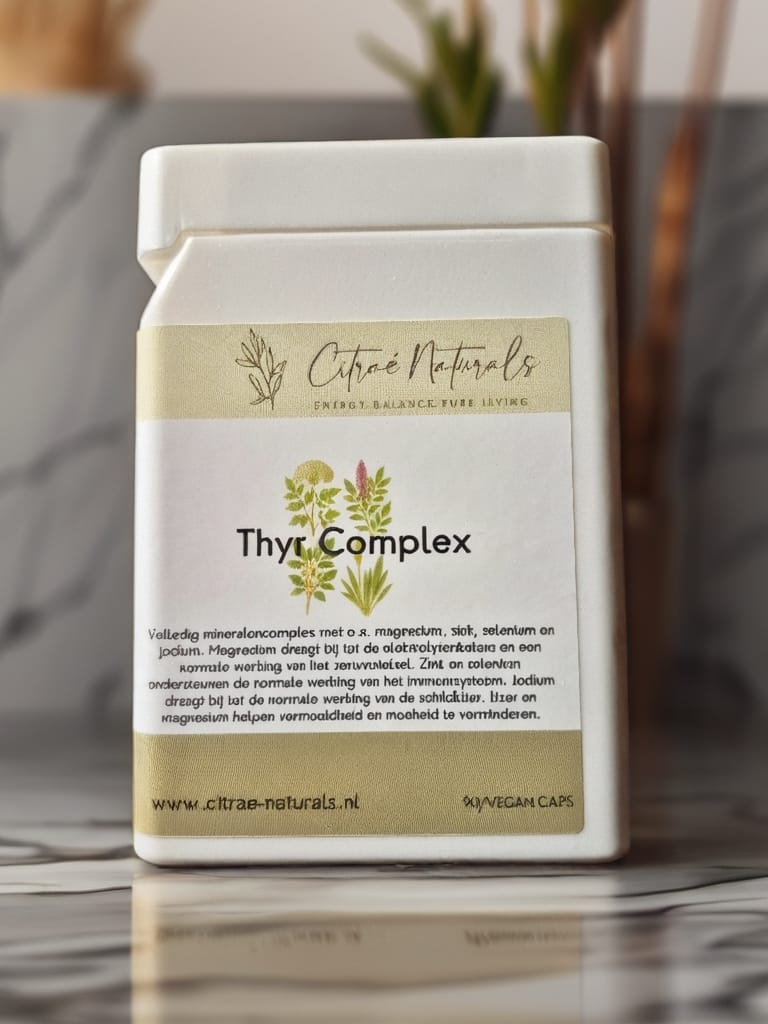 Thyr Complex bevat een doordachte samenstelling van Schüssler-celzouten en ondersteunende mineralen, waaronder Kalium jodatum, Ferrum phosphoricum, Kalium bromatum en Selenium. Deze mix is speciaal samengesteld om energieniveau, stofwisseling en de normale werking van de schildklier te ondersteunen — een natuurlijke keuze voor meer balans en vitaliteit.