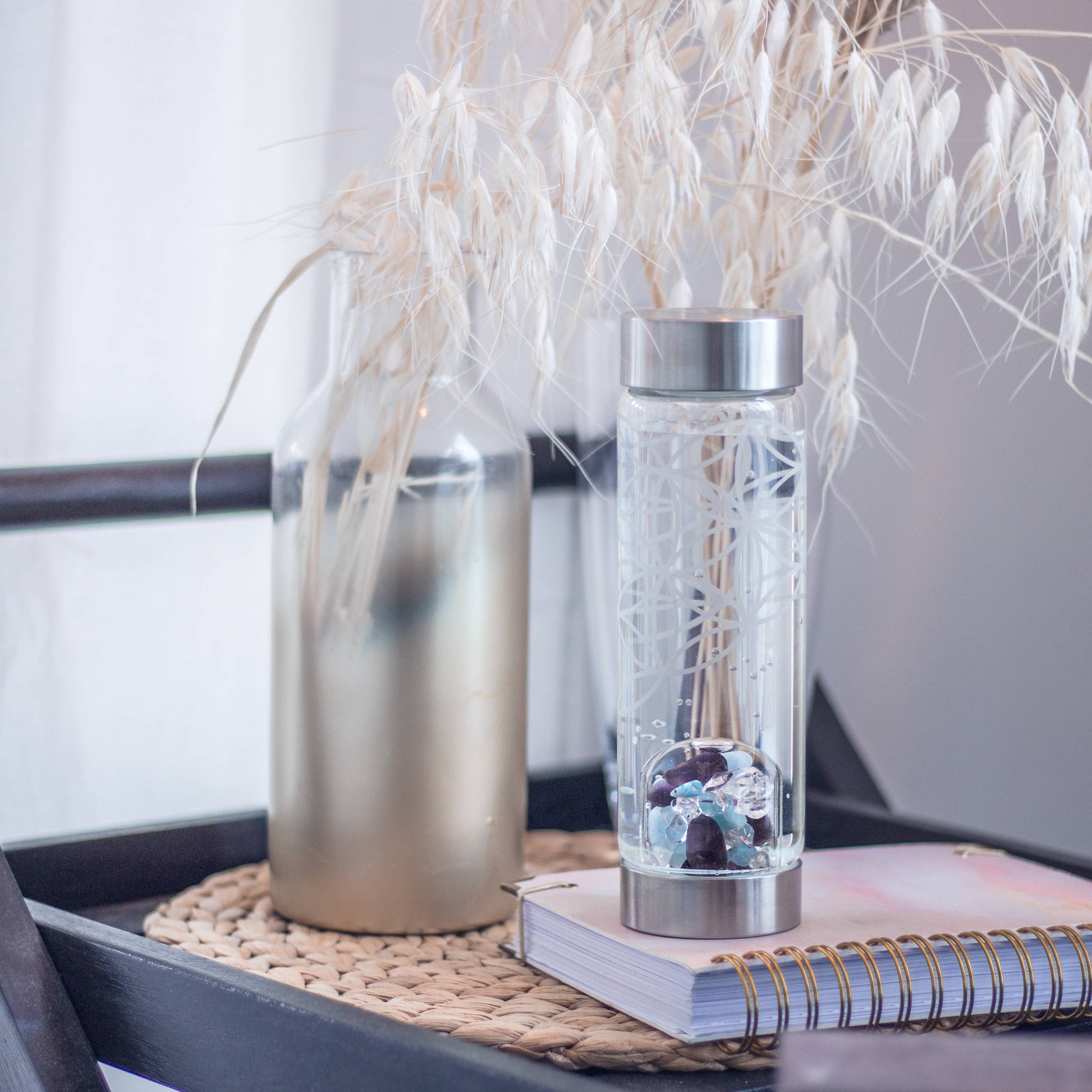 De originele edelsteenfles VIa met vervangbare edelsteenmodule FLOWER OF LIFE en FLOWER OF LIFE-gravure
