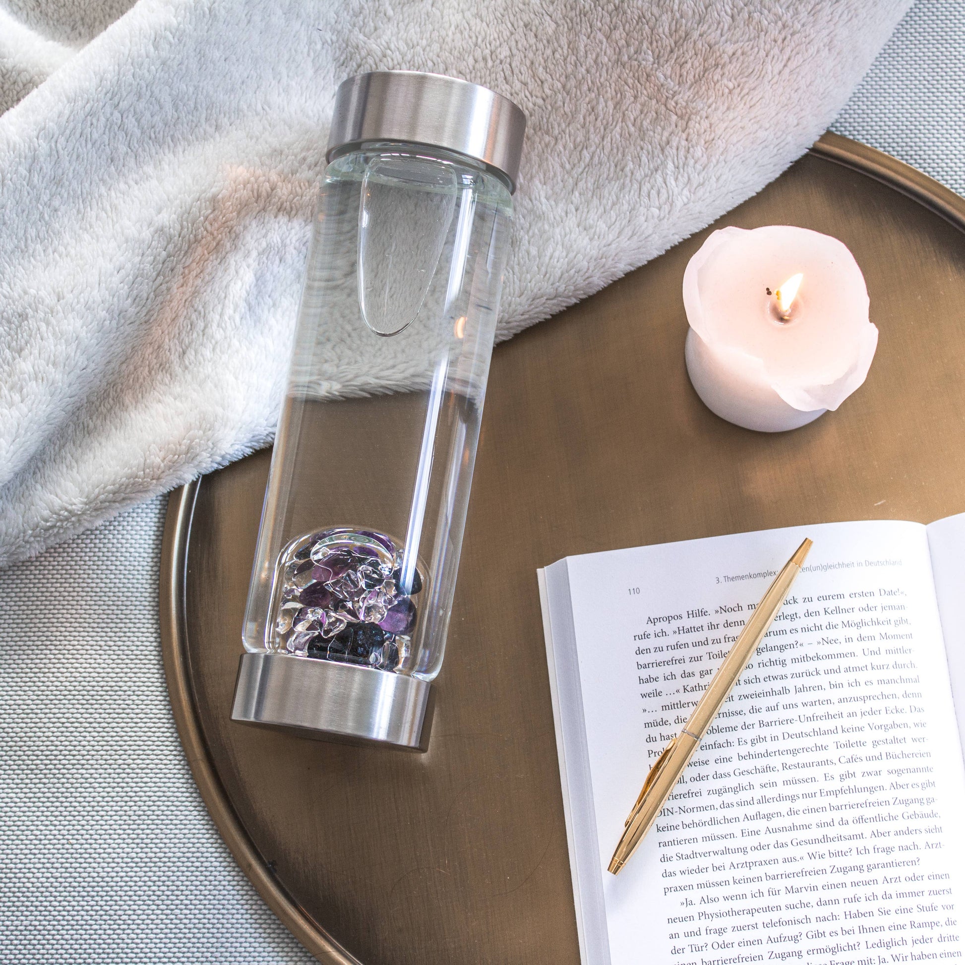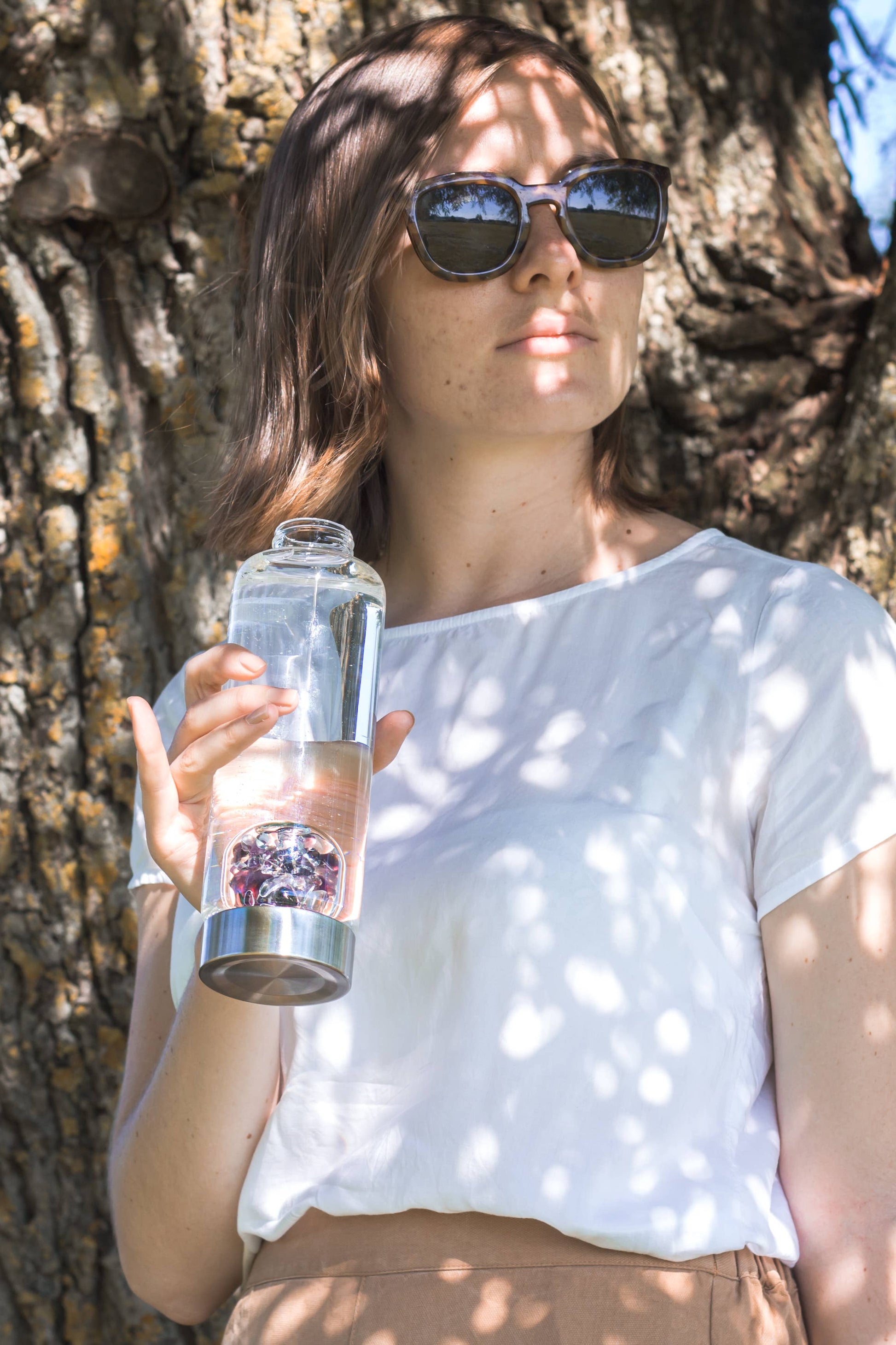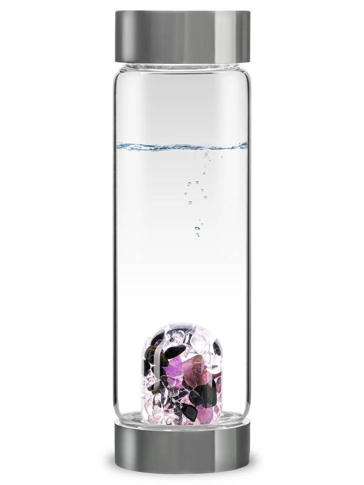ViA is de perfecte metgezel. De robuuste glazen fles is onmisbaar voor iedereen die onderweg van zijn hemelse edelsteenwater wil genieten. We vullen ViA zorgvuldig met de hand met natuurlijke, fairtrade edelstenen. De hermetisch gesloten edelsteenmodule kan op elk moment worden verwijderd en vervangen door een andere module. Compatibel met alle VitaJuwel-edelsteenmodules.
